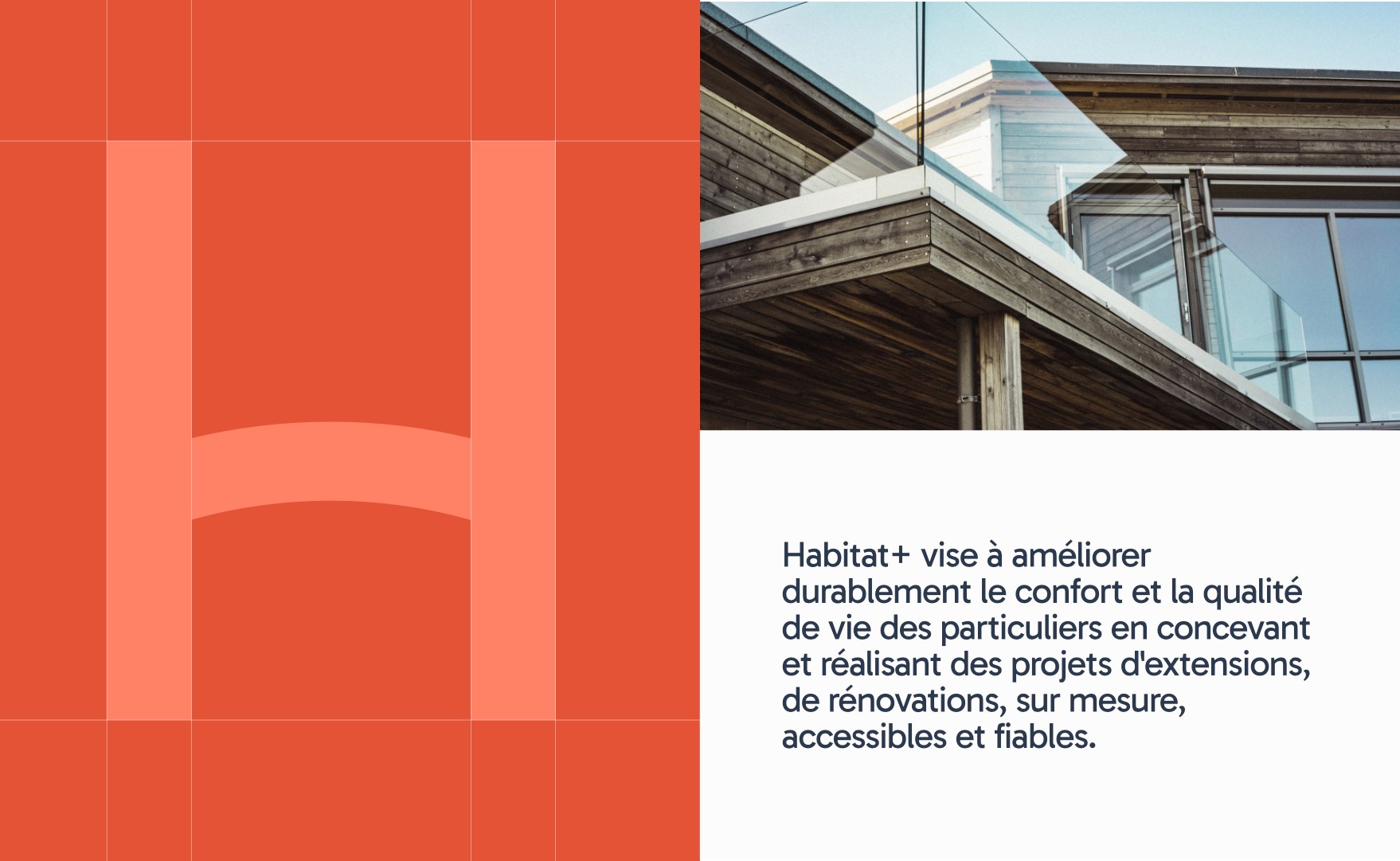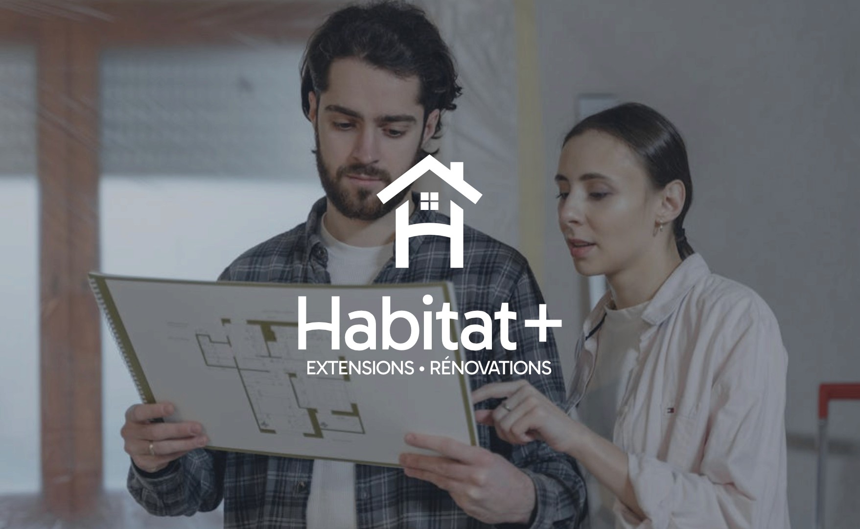 Habitat+ est une entreprise récemment lancée dans le Calvados, spécialisée dans les projets d’extension et de rénovation. L’objectif : concevoir un univers graphique rassurant, lisible et différenciant, puis le décliner sur l’ensemble des supports, jusqu’à la création du site internet.